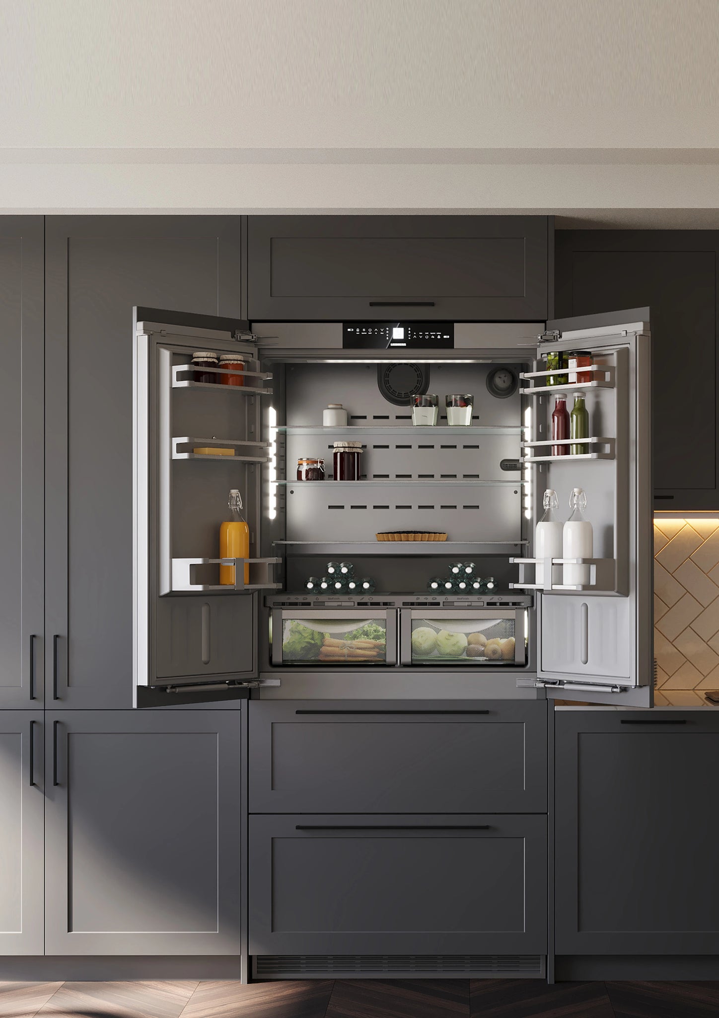 Biofresh long life fruit and vegetable storage, No Frost freezer, Plumbing automatic ice maker, Duo Cooling individual circuits for fridge and freezer prevents food drying out and odour transmission, Soft Close doors and drawers, Glass Line interior with ambient lighting, Touch display, 522L Capacity